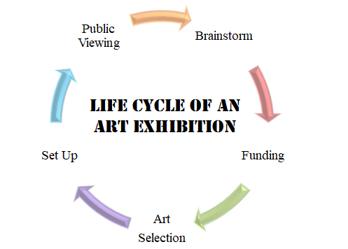 The life cycle of an art exhibition is something most guests do not see all the way through. They pass by a gallery with art being taken down (deinstalation) or setup (installation). In truth the ideas and funding for an exhibition start long before any visitor walks into the gallery. Many people are involved to make this happen. Special events, preparations, mansions, tour guides, security guards, preservation, donors, and more.