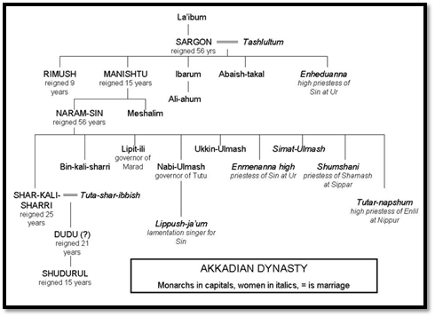 Enheduanna was a high priestess in Ur at the temple of the Moon God Sin as noted on the family tree below by the family member Naram-Sin who would rule later. The region of Naram-Sin is important personally in the life of Enheduanna as one of the three poems is about her own life and struggle. But we will get to that later. Her title was that of En is important because it represents her role as a high priestess is noted by the time of the fourth millennium as stated in chapter 3 “The Robes of the Old, Old Gods: …The title en, used to refer to the high priestess or priest….This designation’s appearance precedes that for king, lugal, by a thousand years, emphasizing the preeminence the institution of the temple had over the political office of the king.” This shows the power and status associated with her title of En.